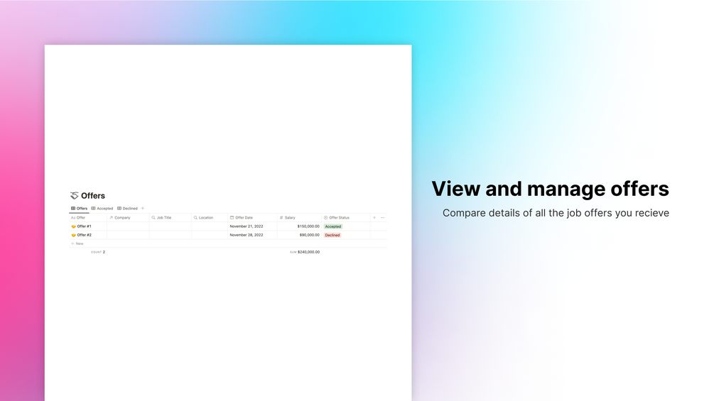 - Offer management table to compare details of job offers